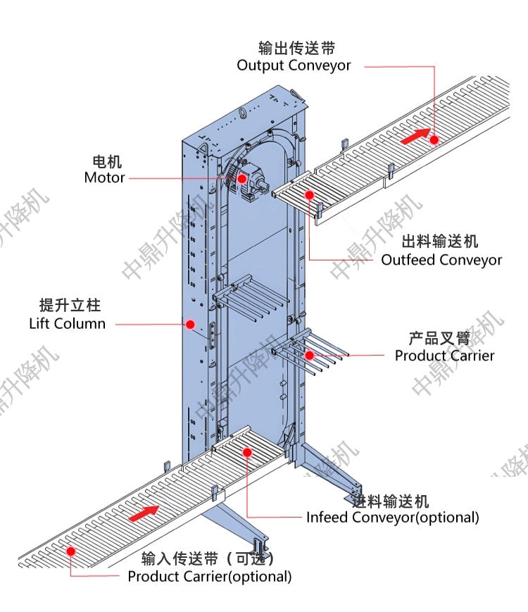 我們的叉臂循環式提升機支持定制化服務,以滿足不同應用需求。可根據實際使用場景定制臺面尺寸、載重能力和提升高度,確保最佳適配性。此外,該設備可實現不同方向的入口和出口,有多種形式的輸送,靈活適應不同的物料運輸模式,提升作業效率。